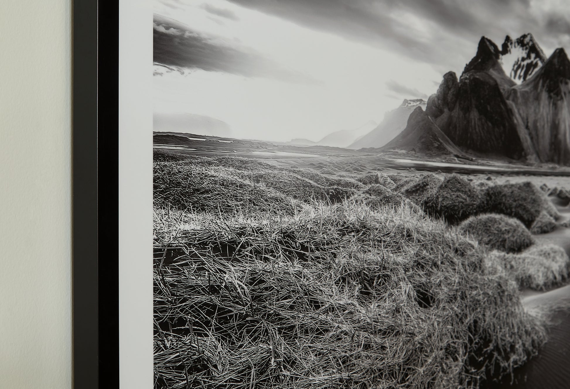 Si te fascina un paisaje impactante, esta obra de arte mural es una maravilla natural. Impresionantemente hermosa, la impresión enmarcada en blanco y negro muestra majestuosas montañas y un arroyo serpenteante. Esta pieza, evocadora y maravillosa, añade un toque de belleza dramática a tu decoración moderna.