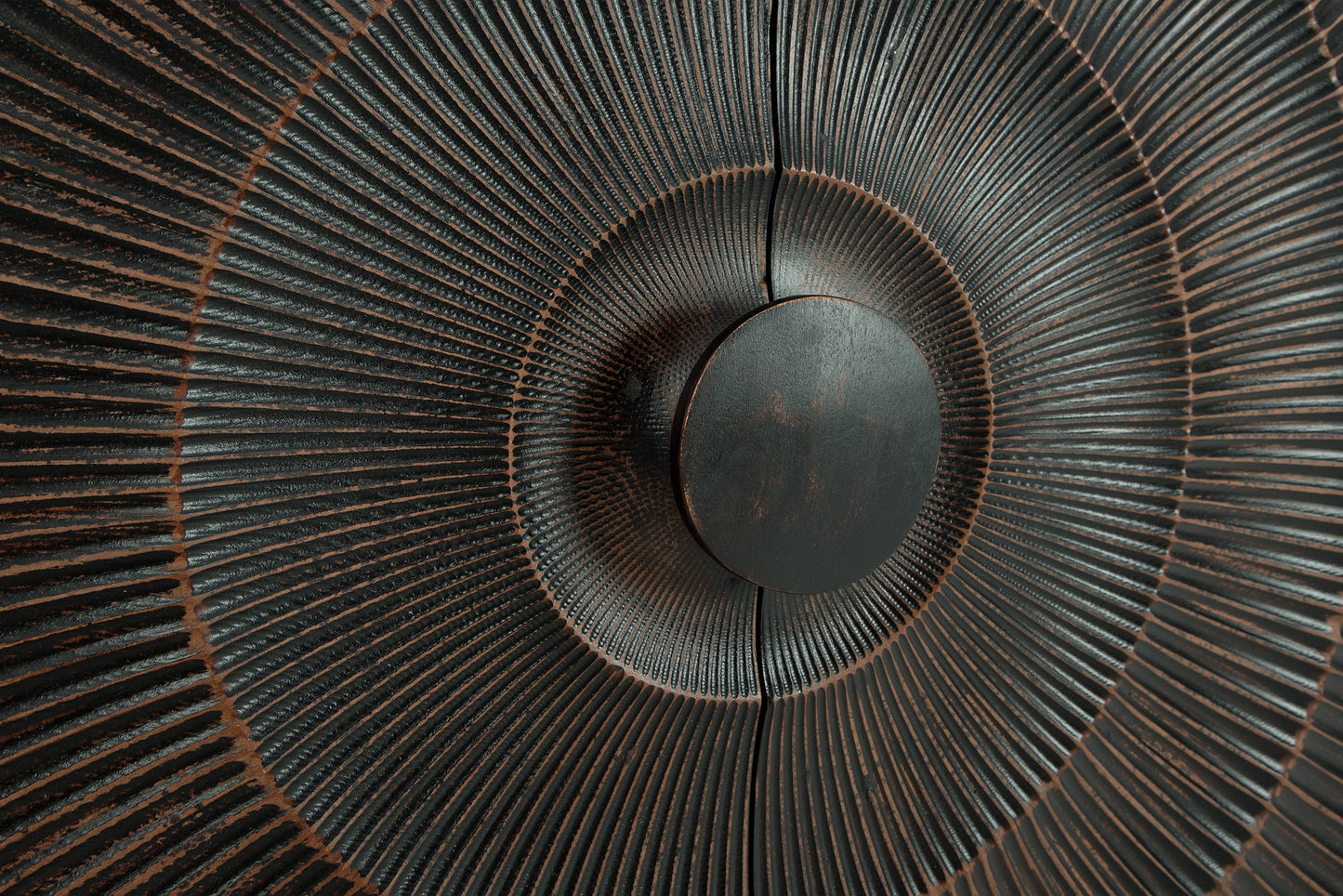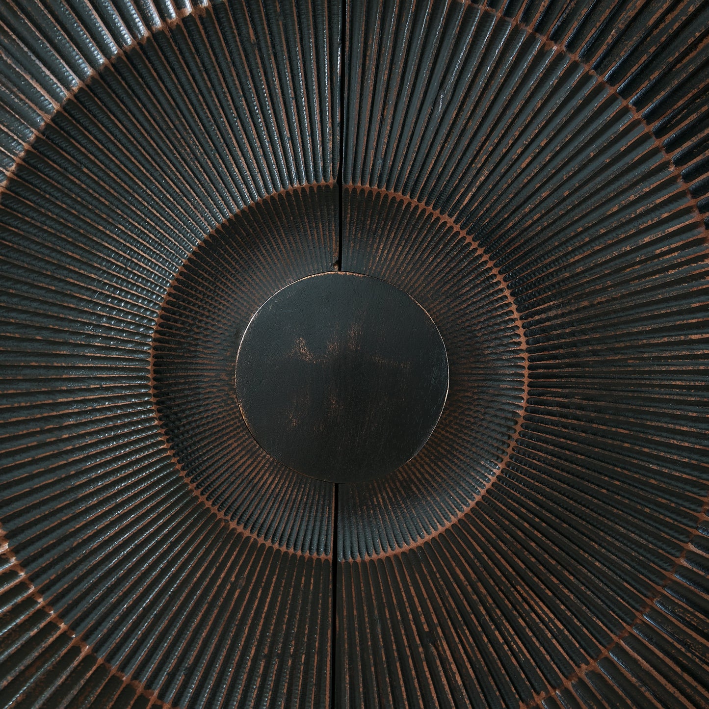 El estilo sofisticado está en auge con este armario con detalles de madera. Sus impresionantes puertas, adornadas con un diseño tallado de rayos de sol y un tirador de madera de gran tamaño, se abren para revelar dos estantes. Su acabado negro envejecido le aporta un toque contemporáneo. Ya sea para guardar cosas o para ocultar el desorden, este armario es una auténtica joya.