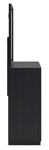 Details | Includes dresser and mirror, Made with pine solids, veneers and engineered wood substrate, Textured black wood stain with waxy topcoat, Hardware-less design, 6 drawers with fully finished interiors, dovetail construction and ball-bearing side glides (top drawers felt lined), Mirror attaches to back of dresser | |