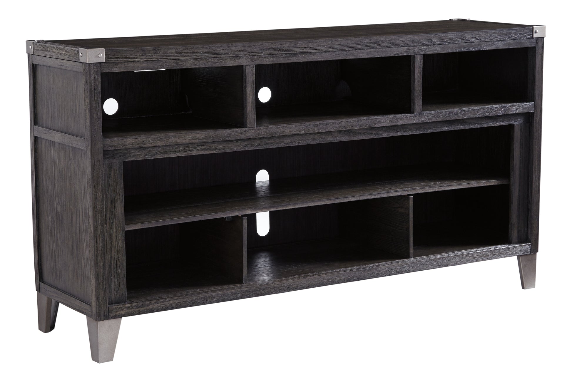 Disfruta viendo la televisión. El estilo rústico-industrial de este mueble para TV, con acabado gris, bordes rectos, detalles en escuadras de zinc y detalles de tachuelas, sin duda complementará cualquier decoración contemporánea. Sus compartimentos abiertos con ventilación ofrecen un amplio espacio en los estantes, ideal para tener todos tus equipos electrónicos a mano. Los prácticos recortes mantienen los cables ocultos. La amplia abertura central del mueble permite colocar un estante (incluido) o un inserto para chimenea (se vende por separado).