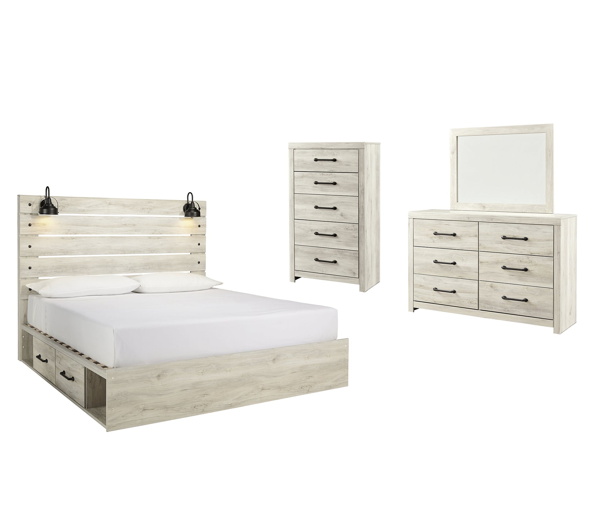 Details | B192-46: Made of engineered wood (MDF/particleboard) and decorative laminate, Wispy white finish over replicated oak grain with authentic touch, Large-scale hardware with dark finish, 5 smooth-gliding drawers, Drawer interiors are lined with a faux linen laminate for a clean, finished look, Safety is a top priority, clothing storage units are designed to meet the most current standard for stability, ASTM F 2057 (ASTM International), Drawers extend out to accommodate maximum access to drawer interior while maintaining safety, B192B19: Includes headboard, footboard, side storage, rails and slats, Made of engineered wood (MDF/particleboard) and decorative laminate, Wispy white finish over replicated oak grain with authentic touch, Large-scale hardware with dark finish, 2 decorative sconce lights, LED with 3 AA batteries, 2 smooth-gliding storage drawers, 2 storage cubbies, 2 slim-profile USB charging ports, Power cord included; UL-listed, Bed does not require additional foundation/box spring; accommodates most zero clearance adjustable bases with the addition of a bunkie board, Mattress available, sold separately, Assembly required, B192B1: Includes dresser with mirror, Made of engineered wood (MDF/particleboard) and decorative laminate, Wispy white finish over replicated oak grain with authentic touch, 6 smooth-gliding drawers, Drawer interiors are lined with a faux linen laminate for a clean, finished look, Large-scale hardware with dark finish, Mirror attaches to back of dresser, Assembly required, B192-92: Made of engineered wood (MDF/particleboard) and decorative laminate, Wispy white finish over replicated oak grain with authentic touch, Large-scale hardware with dark finish, 2 smooth-gliding drawers, Drawers lined with faux linen laminate for finished aesthetic, 2 slim-profile USB charging stations, Power cord included; UL Listed, | |