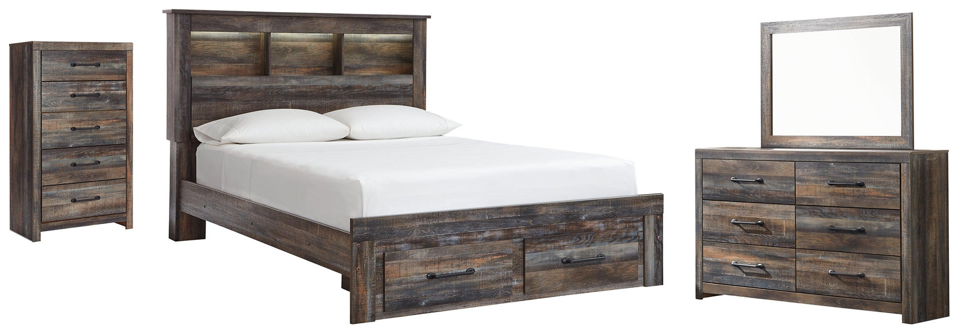 This queen-size bookcase bed with storage, dresser, mirror and chest of drawers is a refined take on barn board beauty. Its complex, replicated wood grain showcases hints of burnt orange and teal tones for a sense of weatherworn authenticity. Three open cubbies lined with a dimming LED light strip keep bedtime reads top of mind. Double drawers at the foot of the bed come in mighty handy. The dresser with six smooth-gliding drawers and chest with five smooth-gliding drawers are lined with faux linen laminate with industrial dark-tone hardware completing this rustic and industrial style bedroom. Mattress and foundation/box spring available, sold separately.