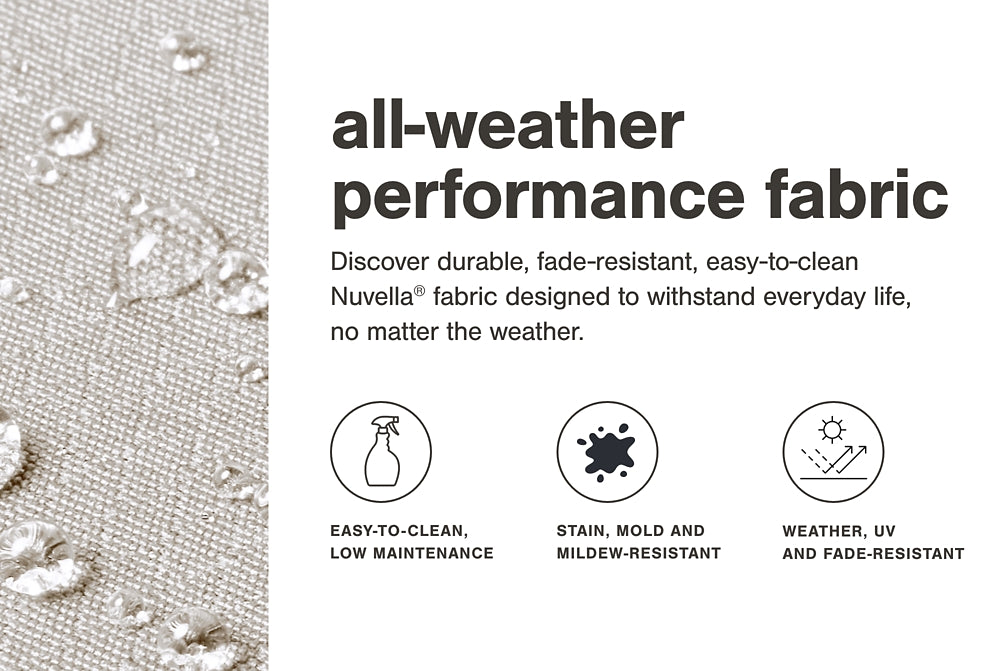 Details | Set of 2, Made of HDPE material, Gray finish with textured wood look, Seat/back cushions covered in solution-dyed Nuvella® (polyester) high-performance fabric, All-weather foam cushion core wrapped in soft polyester, Clean fabric with mild soap and water, let air dry; for stubborn stains, use a solution of 4 oz. bleach to 28 oz. water, Imported fabric and fill, Assembly required | |