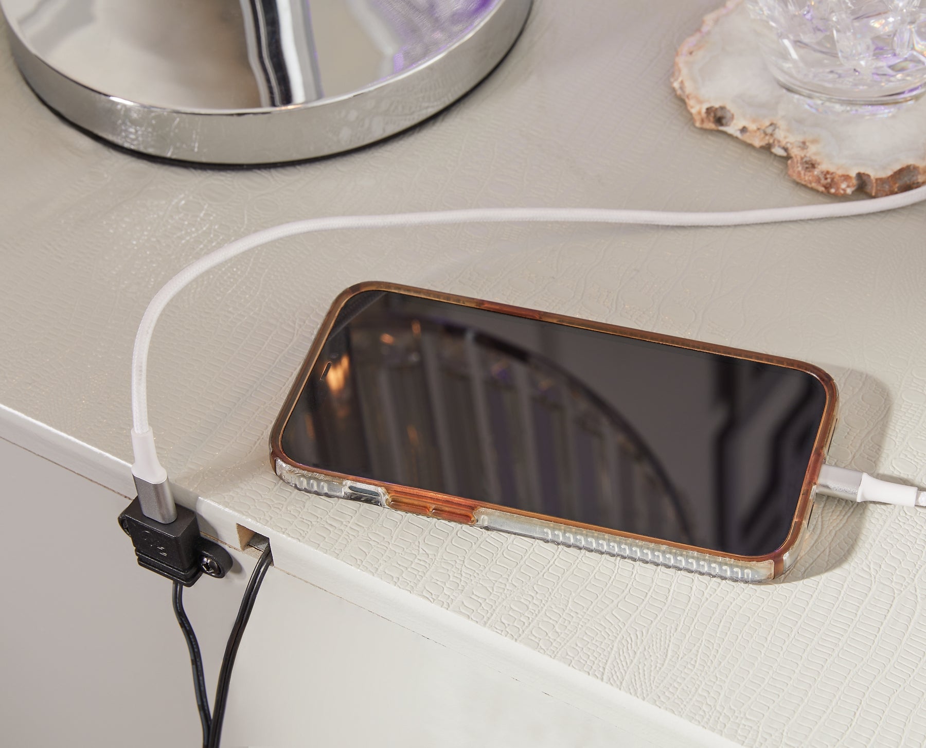 Bright, bold luxury. This nightstand dazzles with its attention to detail. Your love of glamorous style is reflected in its all-over faux gator in a metallic finish, exquisitely paired with faceted chrome-tone details. Complete with wireless and USB charging, it inspires you to live luxuriously every day—whether you're charging up to go out or scrolling on socials before bed.